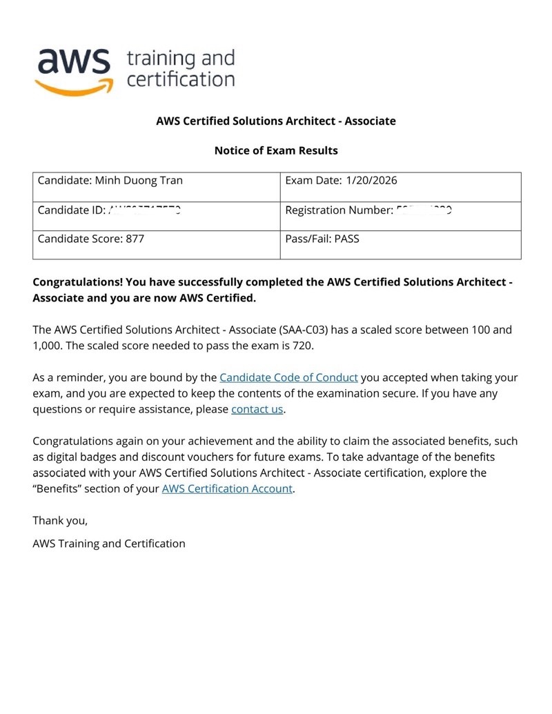 Before diving into the study plan, here is Tran Minh Duong’s official AWS Solutions Architect Associate (SAA-C03) exam result.